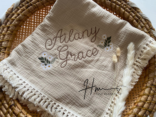 Personalized Embroidered Baby Swaddle Blanket: Organic Cotton Muslin, Boho Floral