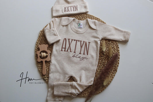 Personalized Baby Boy Coming Home Outfit: Embroidered Name Romper & Hat
