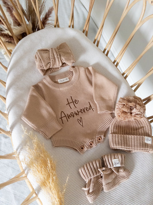Embroidered He Answered Knit Romper(ROMPER ONLY)