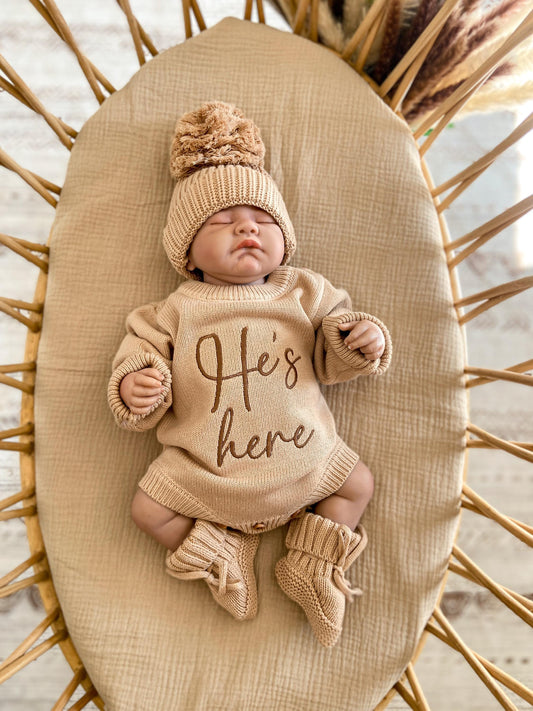 He is here Embroidered Knit Newborn Romper