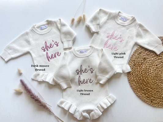 Embroidered name baby romper, newborn girl coming home knit ruffle outfit, custom birth name announcement