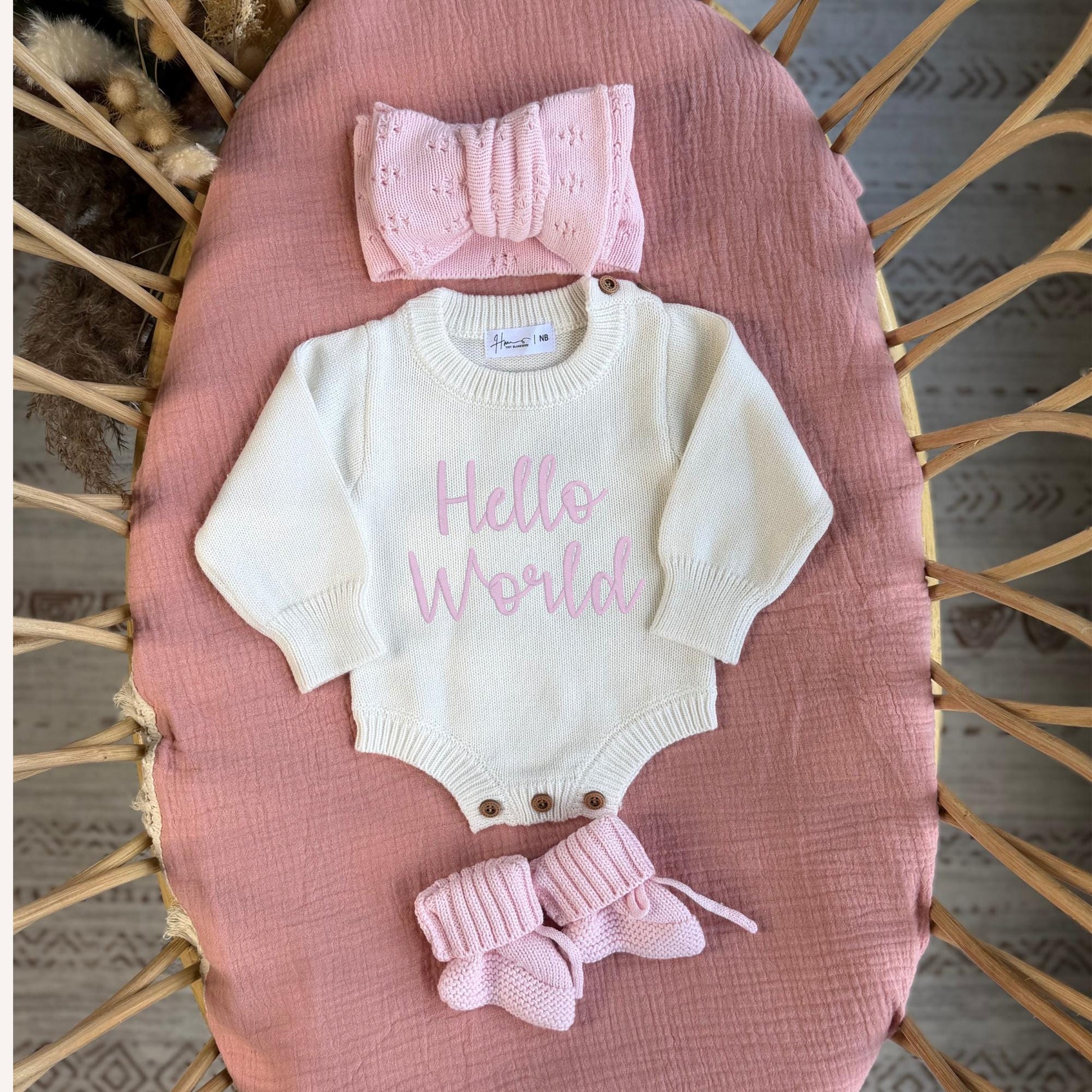 Hello World Embroidered Newborn set -Romper, newborn outfit, going home baby outfit, baby shower gift.