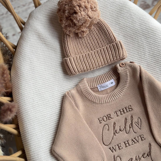 Wrap your little love in comfort with our ‘Embroidered For This Child We Have Prayed Knit Romper