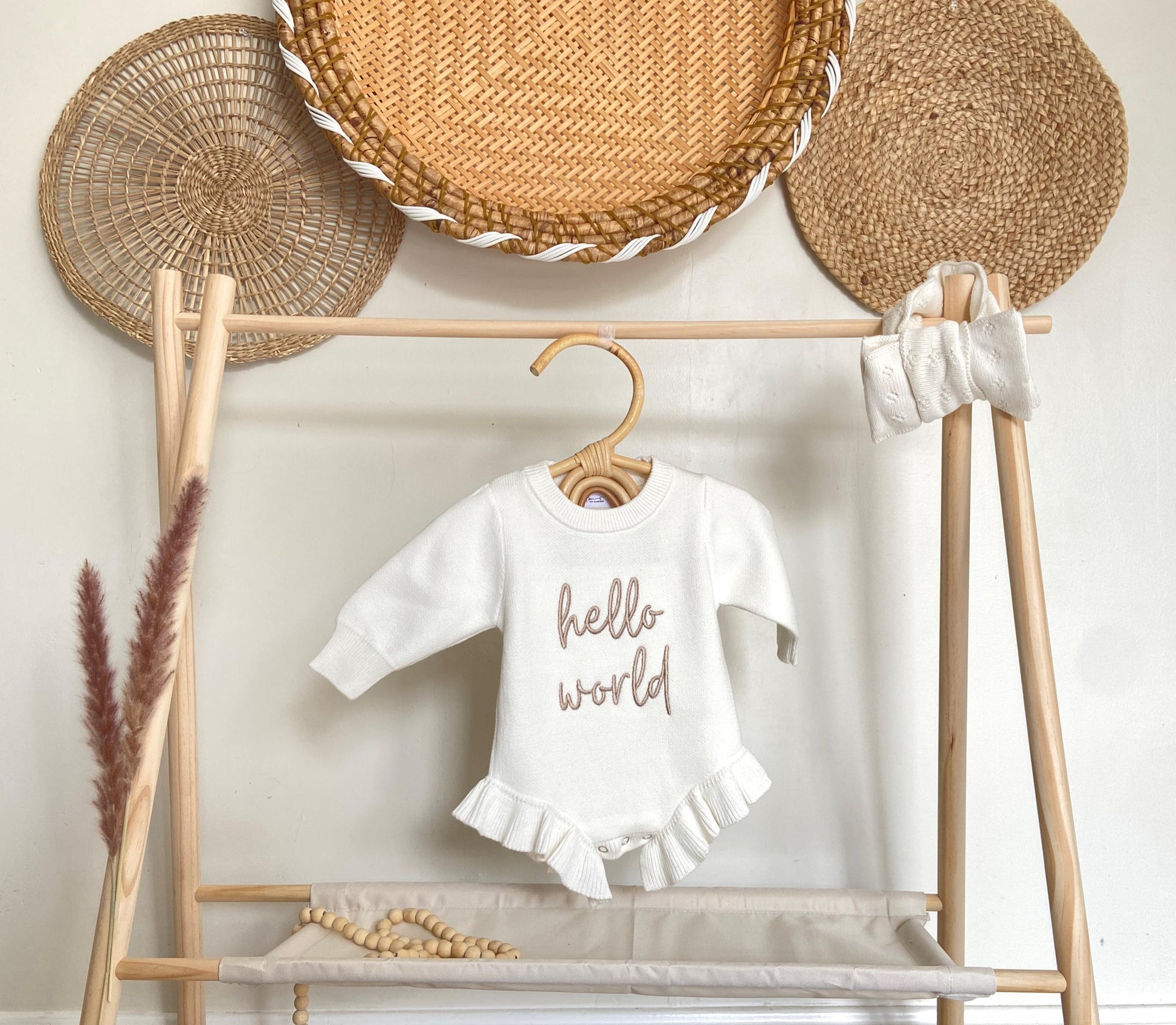 Embroidered Newborn Romper: Hello World Outfit, Ruffle Knit Cotton
