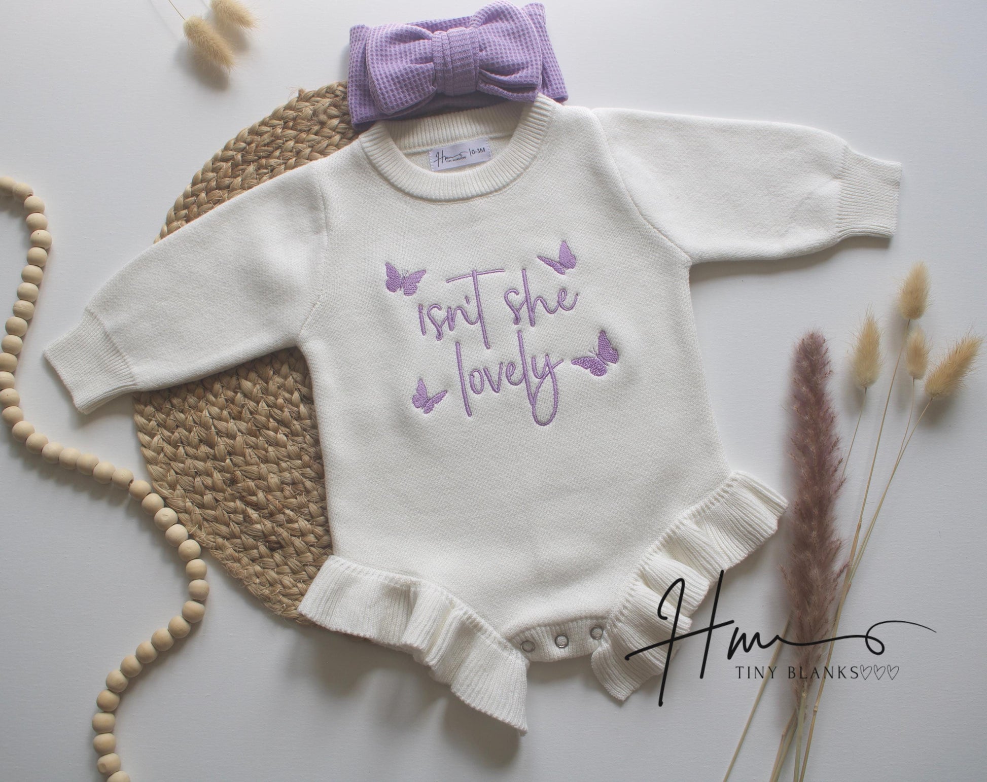 Personalized ruffle knit romper in off white and light pink color made from 100% cotton, with optional matching headband. Embroidered with your baby’s name. Perfect for birth announcements, coming home outfits, or baby shower gifts.