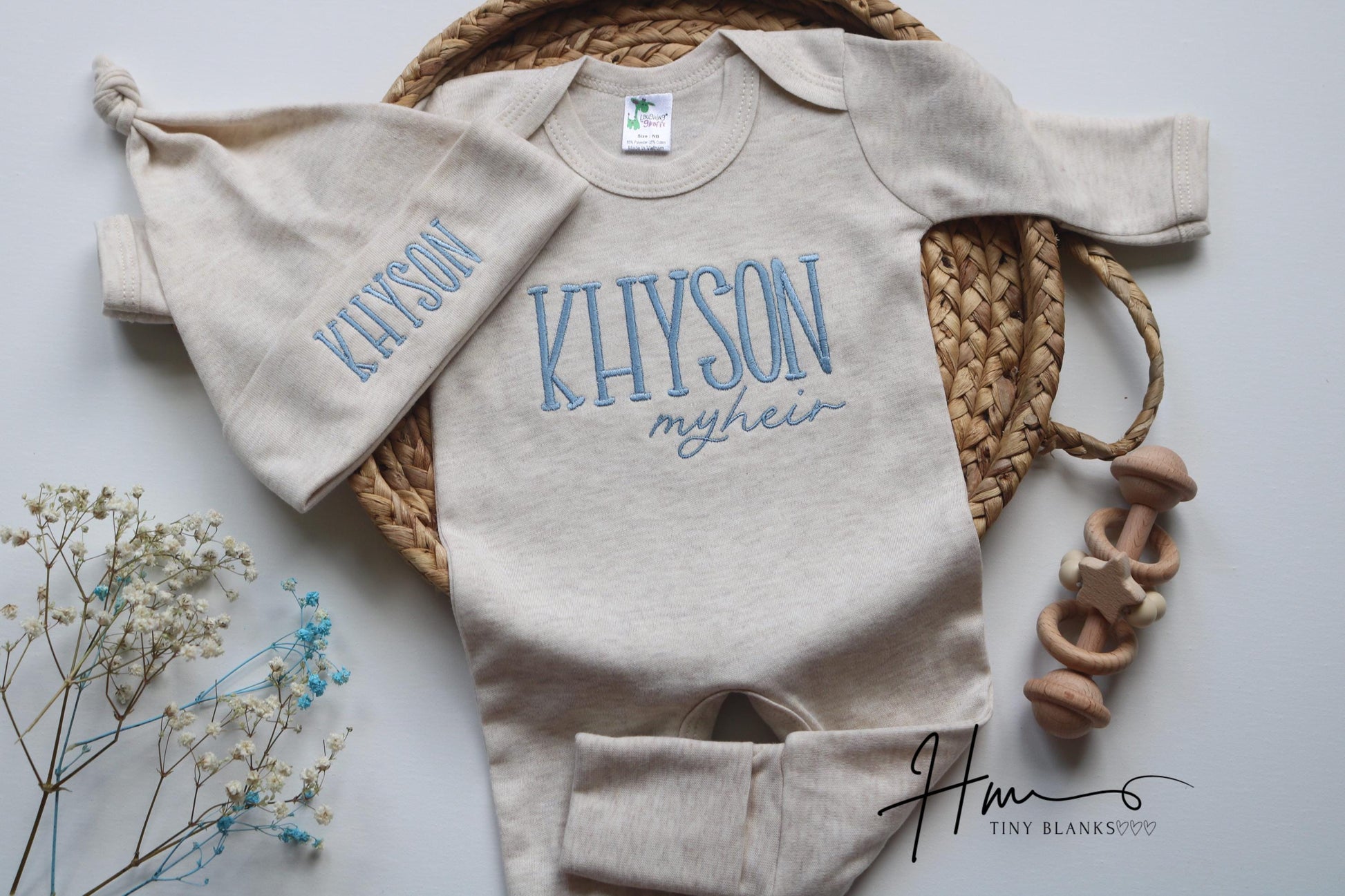 This sweet sleeper makes the perfect baby shower gift, hospital outfit, or coming home outfit. This features an ultra soft romper with first name stitched uppercase letters in dusty blue color middle name is stitched all in lowercase letters, as shown in all of the listing photos. You can also choose the matching knotted hat.