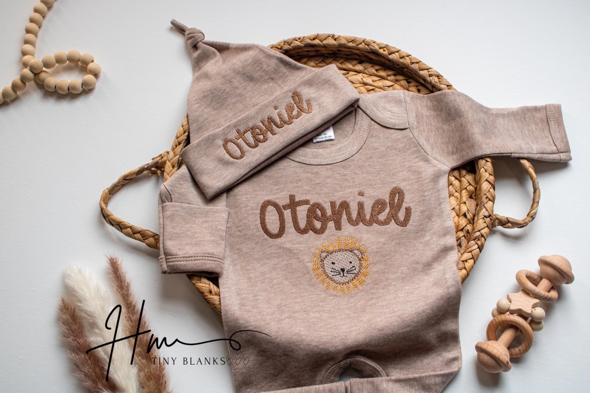 This sweet sleeper makes the perfect baby shower gift, hospital outfit, or coming home outfit. This features an ultra soft Heather Truffle romper with first name stitched in brown color as shown in all of the listing photos. You can also choose the matching knotted hat.
