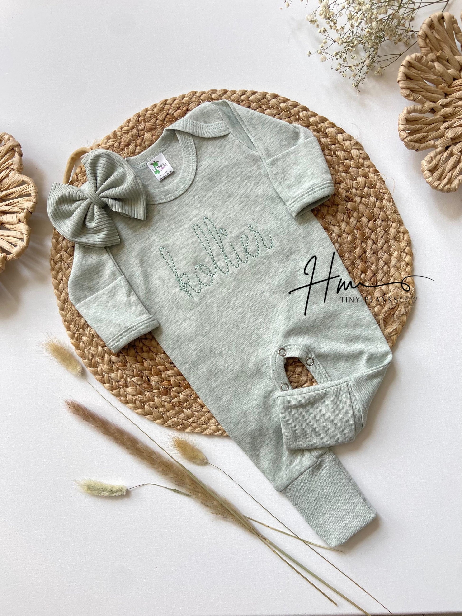 This sweet sleeper makes the perfect baby shower gift, hospital outfit, or coming home outfit. This features an ultra soft sage romper with a sweet vintage floral initial stitched name in a light sage green thread color . You can also choose The matching bow sage color with a nylon headband .