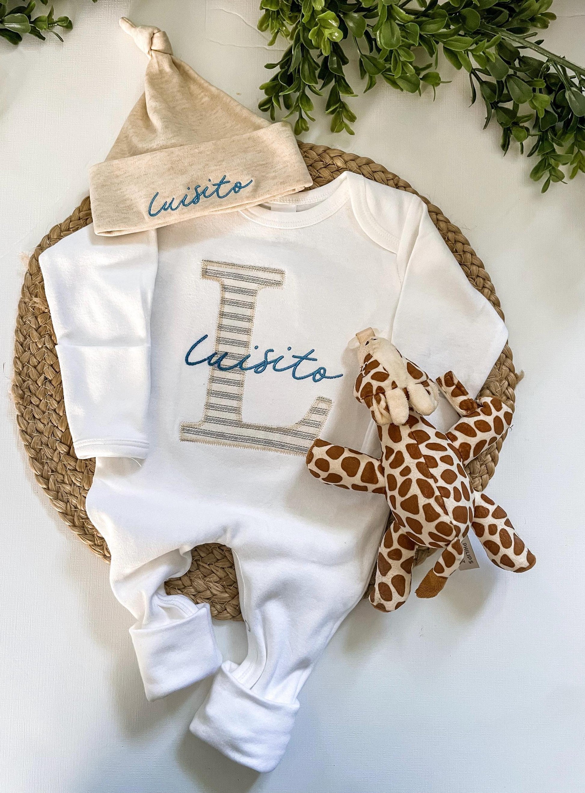 Personalized Baby Romper and Hat Set: Embroidered Name, Fold Over Footies