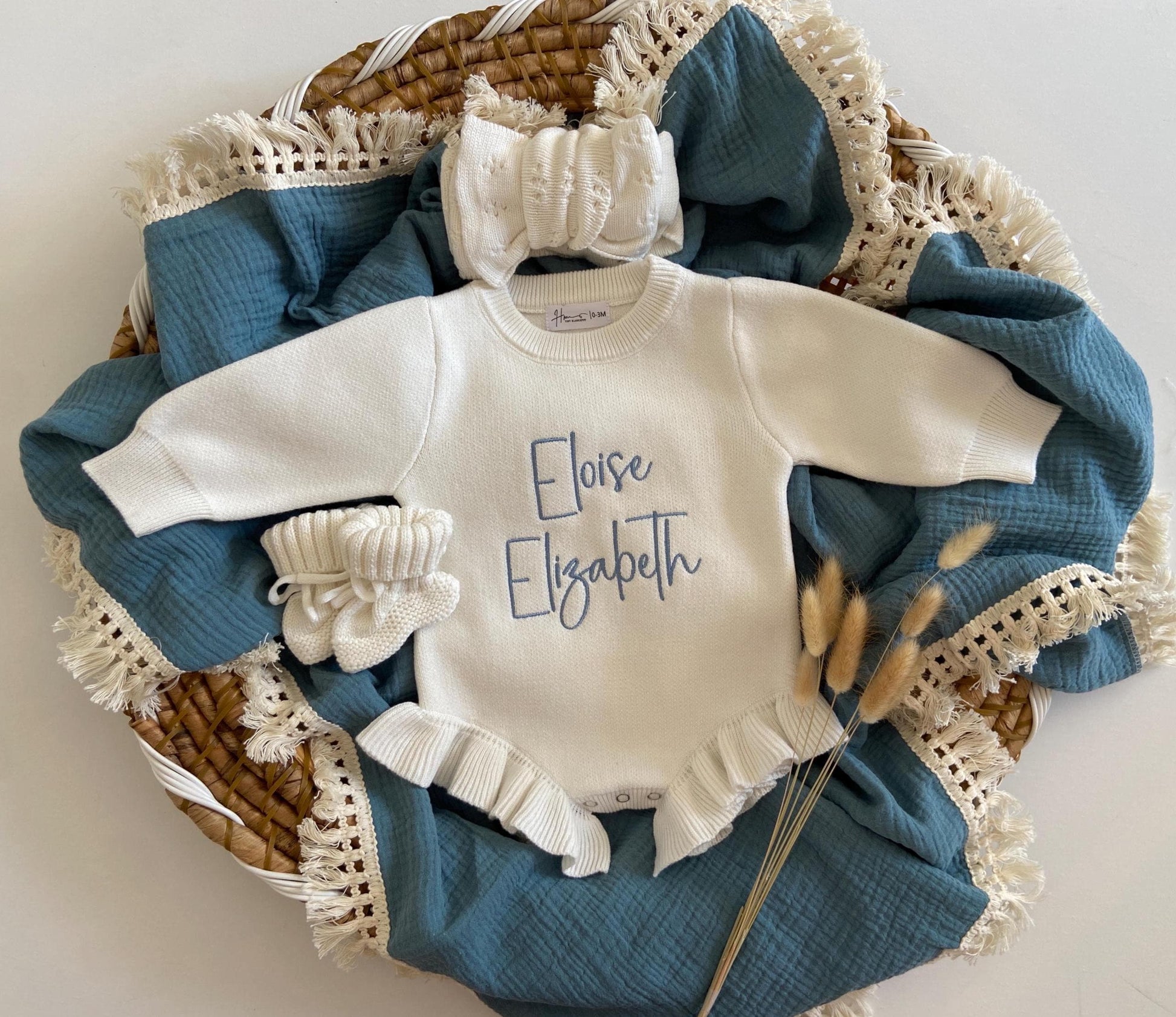 Personalized ruffle knit romper in off white color made from 100% cotton, with optional matching headband. Embroidered with your baby’s name. Perfect for birth announcements, coming home outfits, or baby shower gifts.