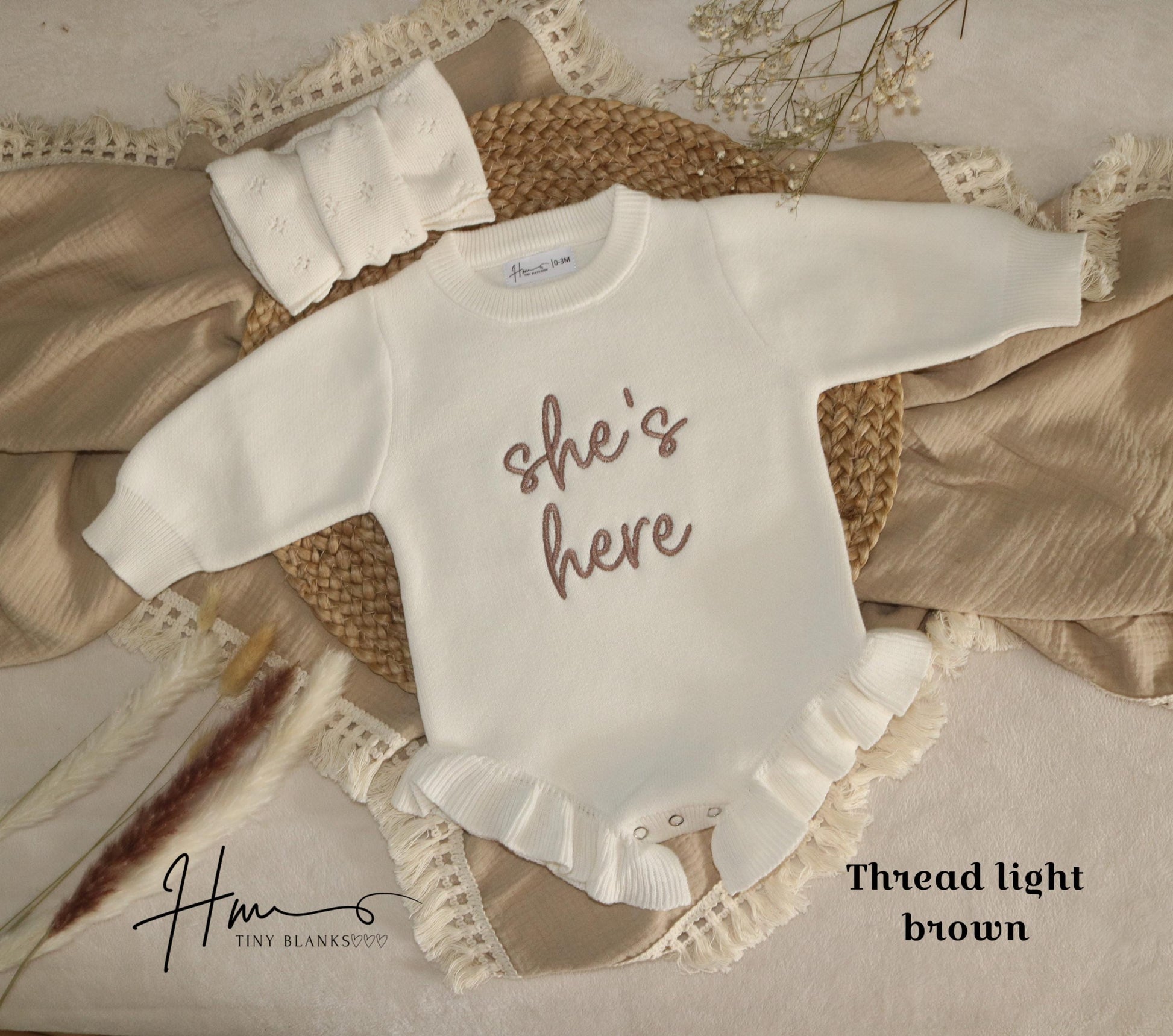 She’s here embroidered Romper, knit ribbed ruffle romper custom, gender reveal announcement, it’s a girl